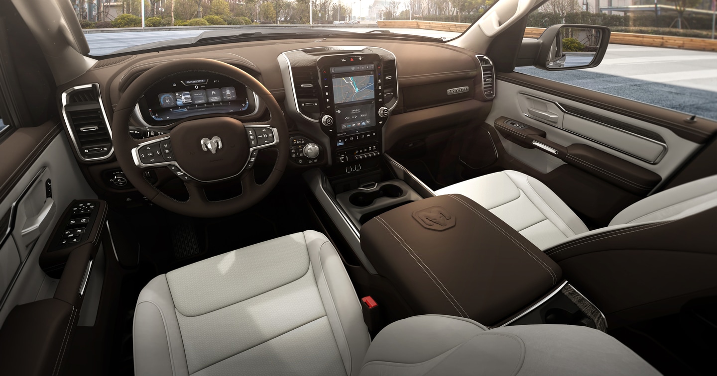 Step inside the 2025 Ram 1500 and be greeted by a spacious and well-appointed interior. Premium materials, such as leather upholstery, adorn the seats and surfaces, creating a luxurious and inviting atmosphere. The front seats offer power adjustment, heating, and ventilation, ensuring optimal comfort during your drives around Bellevue. The Ram 1500's interior is designed with your convenience in mind. Ample storage solutions, including a large center console and clever compartments, provide plenty of space for your essentials. The advanced Uconnect® 5 infotainment system, with its intuitive touchscreen display, keeps you connected and entertained on the roads of Shelby.